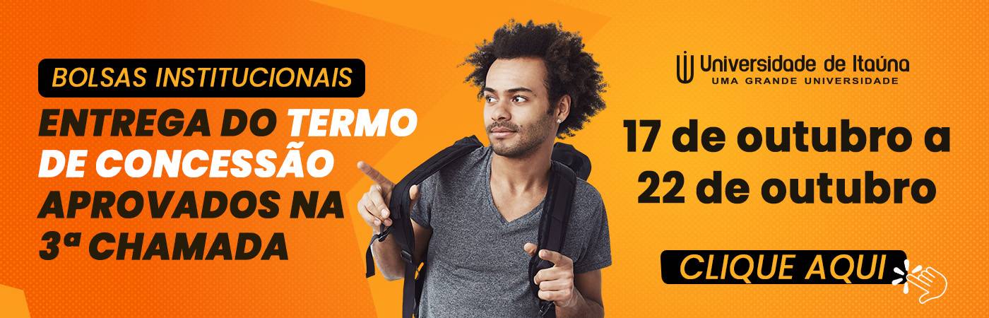 Fundação Universidade de Itaúna e Universidade de Itaúna Aprovados na 3º chamada Os alunos aprovados na 3ª chamada deverão assinar e entregar o termo de concessão de 17 a 22 de outubro de 2025, na Secretaria do Curso. O termo de concessão estará disponível na Área do Aluno, na aba Bolsas