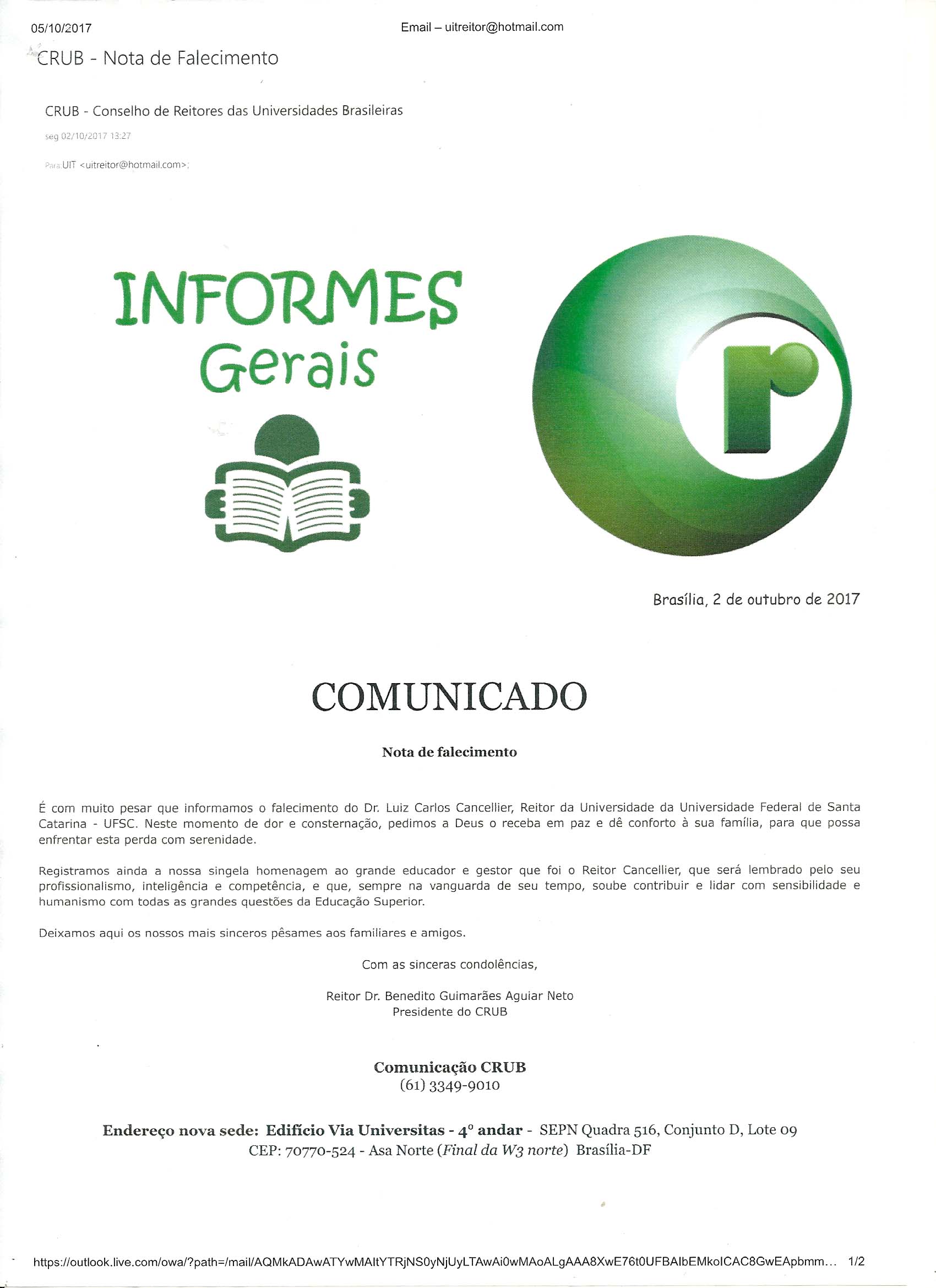 A Universidade de Itaúna manifesta o seu profundo pesar pelo passamento do Reitor da Universidade Federal de Santa Catarina